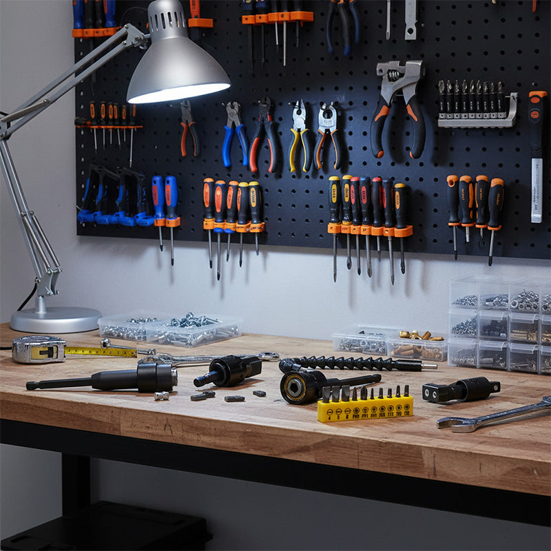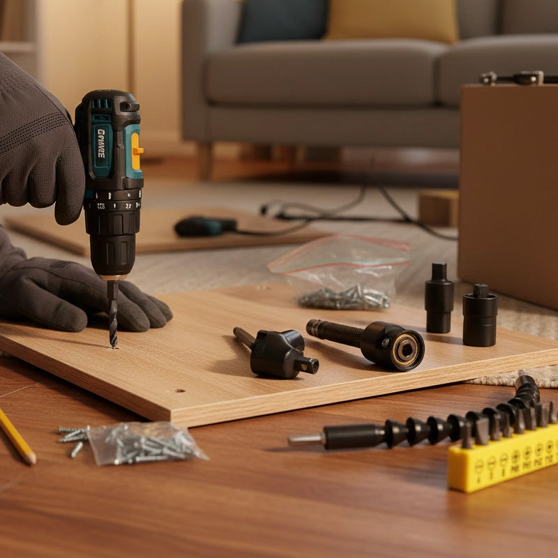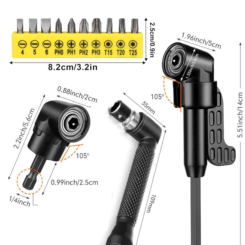 Drill extension kit: The drill extension kit is made of heavy-duty chrome vanadium steel for long-term durability and reliable performance. It includes a flexible drill extension, 105 degree right angle drill adapters, a 90 degree L-shaped screwdriver wrench, 360 degree rotatable impact bits, and a combination screwdriver bit set for versatile use.