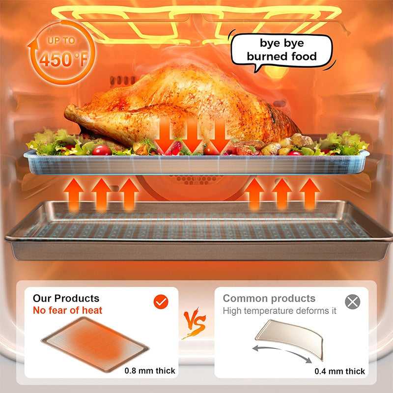 Premium extra-thick material: With 57% thicker carbon steel, these durable oven trays are constructed from heavy-gauge carbon steel for stability, even heat distribution, and durability for years to come. Warranty against peeling off with heat-resistance temperature: 450℉.