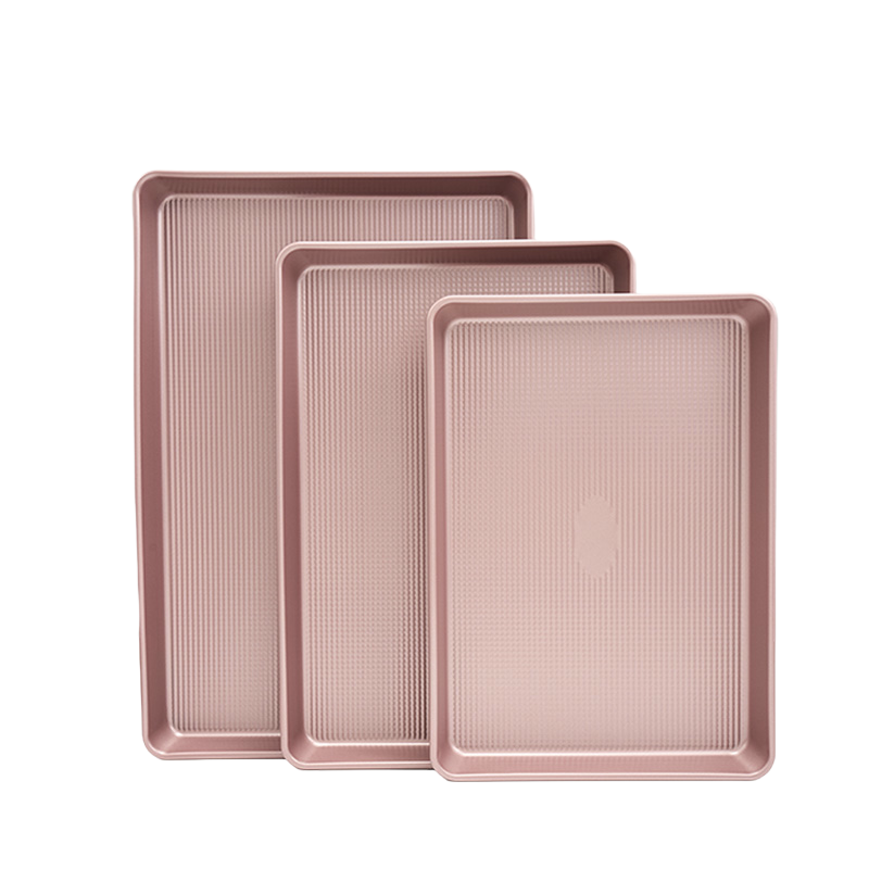 I've been using these baking sheets for a few weeks now and they're fantastic! The diamond texture really makes a difference - my cookies bake evenly every time. Cleanup is a breeze too, just wipe them down. The champagne gold color is so pretty, it makes my kitchen look more upscale.