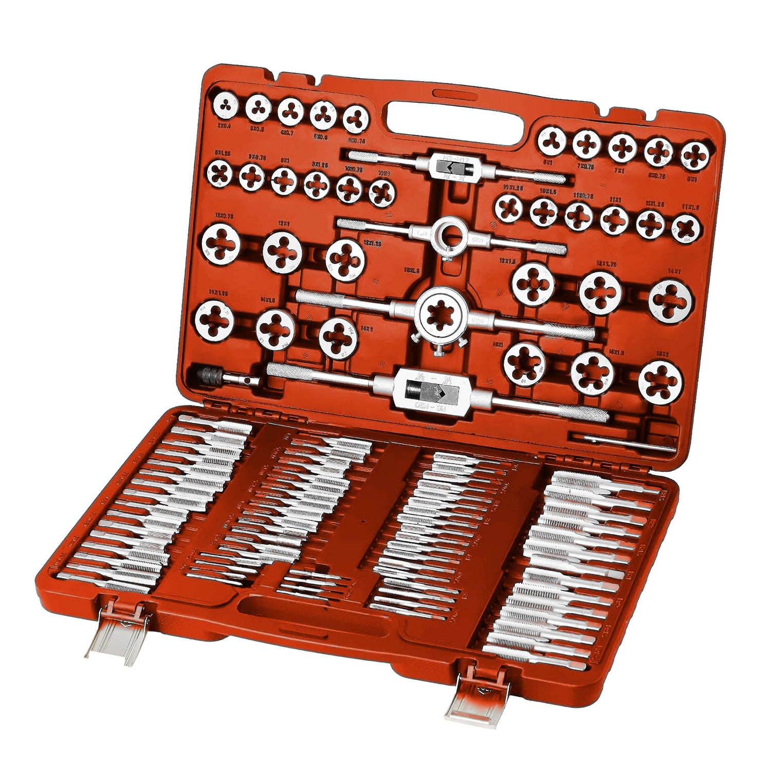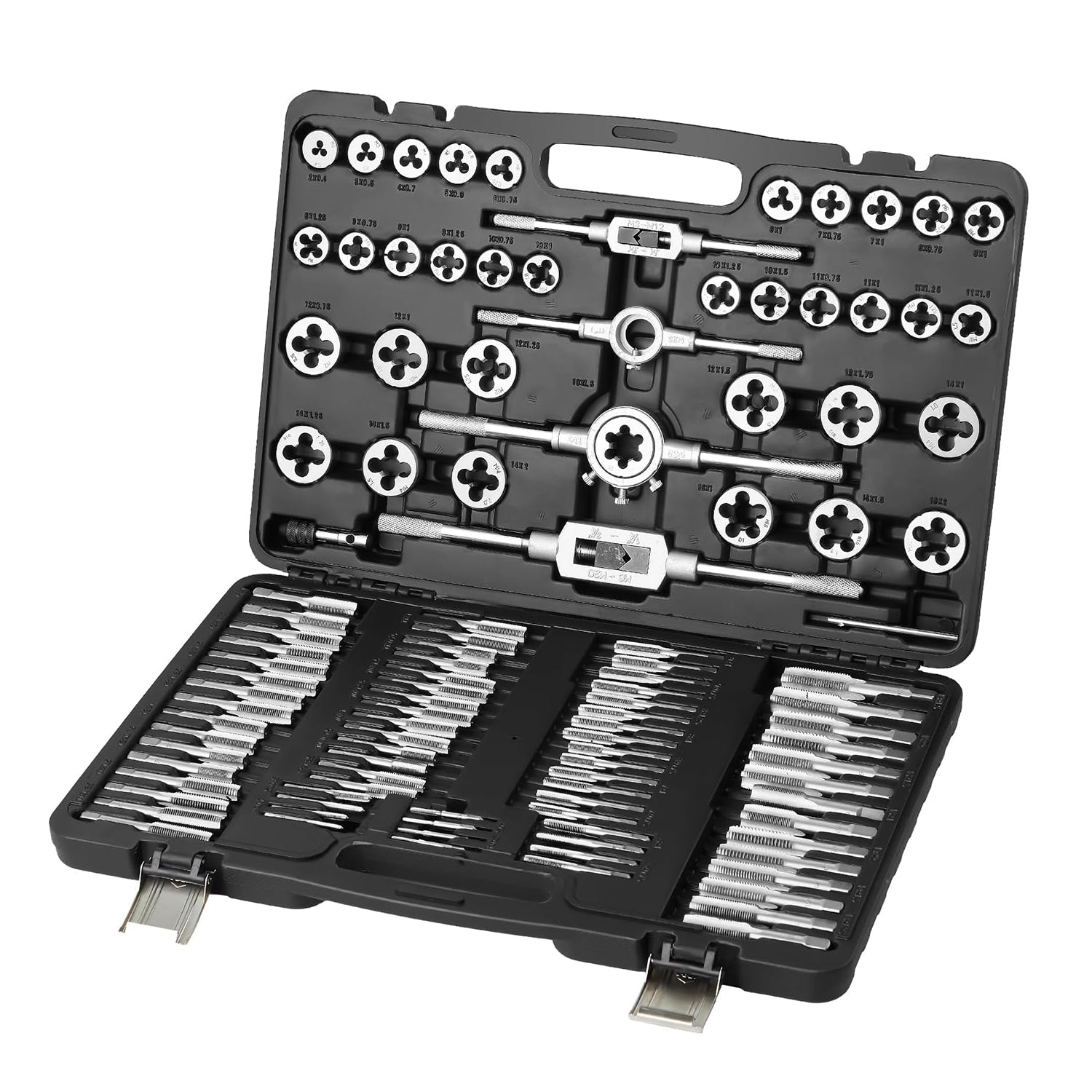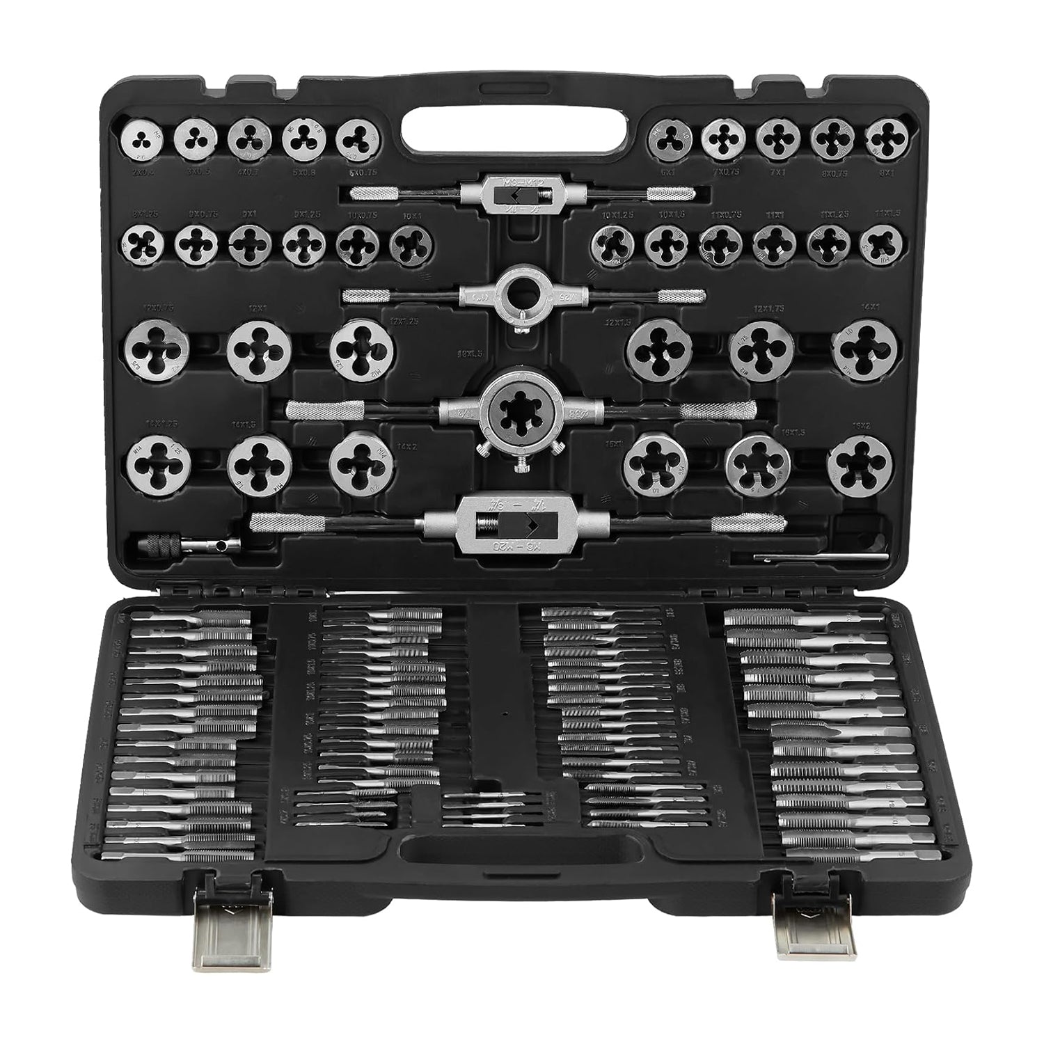 Most Popular Sizes Included: This tap and die set comes with 110 pieces in total: 35 pcs plug taps, 35 pieces taper taps, 35 pcs dies, 2 tap holders(M2 - M12 (1/16" - 1/2"& M6 - M20 (1/4" - 3/4")), 2 die holders (200mm (1" diameter bore)& 270 mm (1 1/2" diameter bore) and 1 T-bar tap wrench, most popular sizes included.