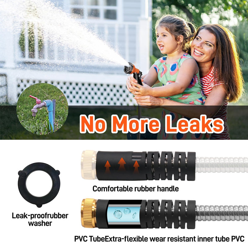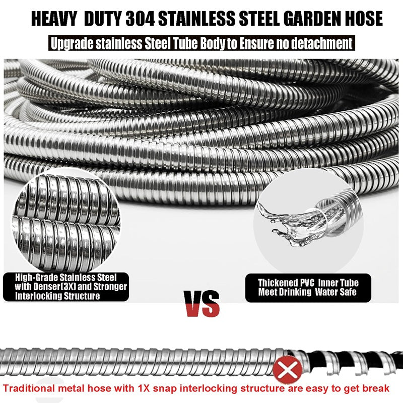 • Durable garden hose metal: Made of commercial stainless steel which do withstand harsh conditions without rusting, corroding, scuffing, leaking, or tearing. Adopt the latest stainless steel 3X snap interlocking structure which is denser and stronger than the traditional metal hose to ensure no detachment for a longer lifespan.