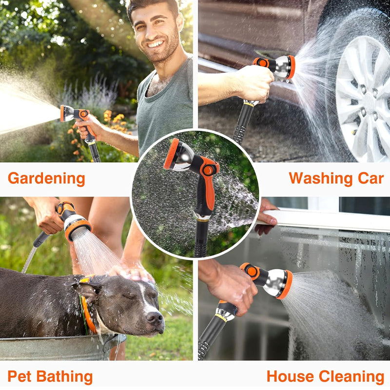• 10 function metal nozzle: Each water hose equipped with a 10 function metal nozzle which features an ergonomic-designed grip. Use your thumb to turn on the switch to control the flow of water, no need to squeeze the trigger handle too hard so this kind of nozzle won't put pressure on your fingers. You will be pleasantly surprised with a wide range of watering modes to meet the needs of different occasions, such as garden watering, car washing, pet bathing, pool cleaning.
