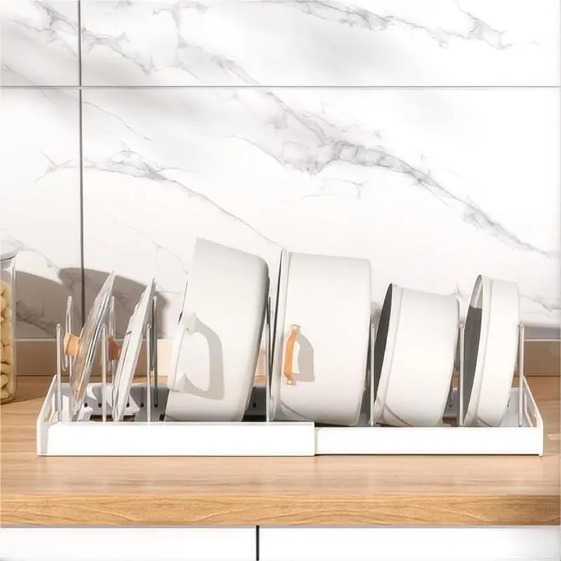 • Installation: Easy to install by hand, without any tools: you can stretch the appropriate length of pan organizer rack and insert the dividers into the grooves according to the size of your pots and pans.