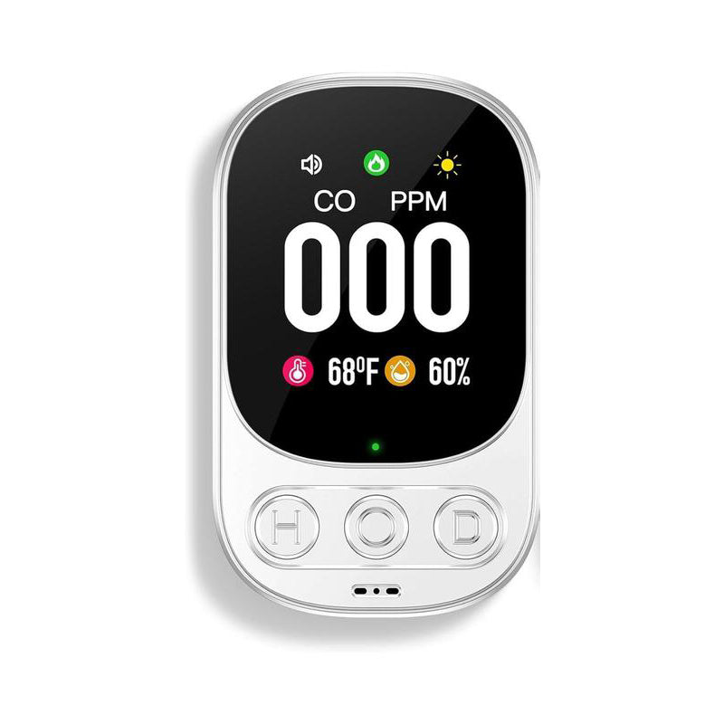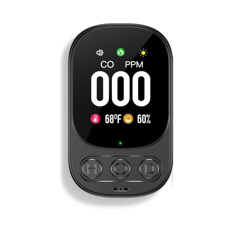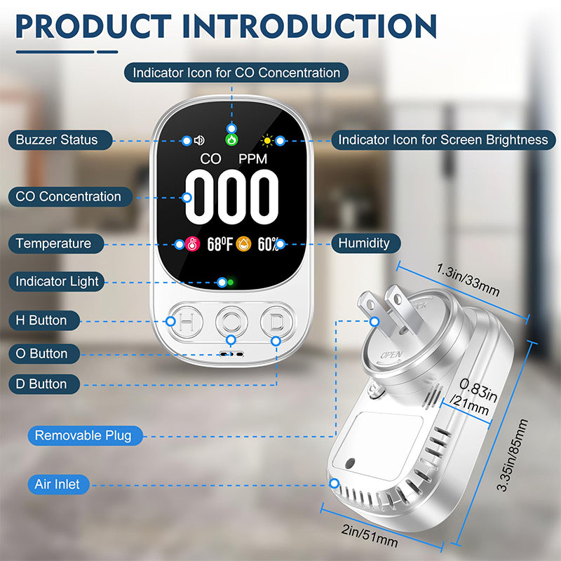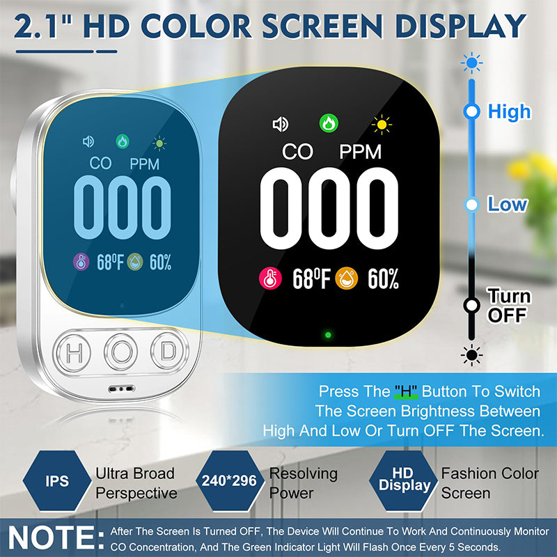 • Easy to Use: Short press the "O" button to start self-test, if the green indicator light flashes 3 times and 3 beeps are emitted, the device is normal; long press the "O" button to switch between temperature units ℃ / ℉. Short press "D" button to turn on or off the buzzer. Short press "H" button to adjust the brightness of the screen: high - low - turn off the backlight (when the backlight is off, the green indicator light flashes once every 5 seconds, which means the device is working).