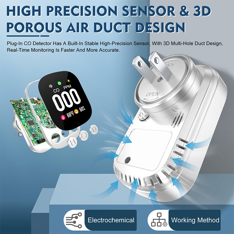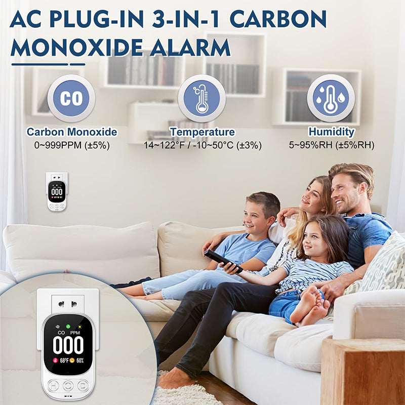 • Plug-in 3-in-1 CO Detector: Plug-in 3-in-1 carbon monoxide detector can monitor carbon monoxide, temperature and humidity in the current environment in real time. Equipped with advanced high reliability electrochemical sensor (5 years life span), it can detect CO range from 0~999PPM (±5%), temperature range from 14~122℉/ -10~50℃ (±3%), humidity range from 5~95%RH (±5%RH). Data refresh in 2 seconds without delay, real-time monitoring of gas safety in the environment.
