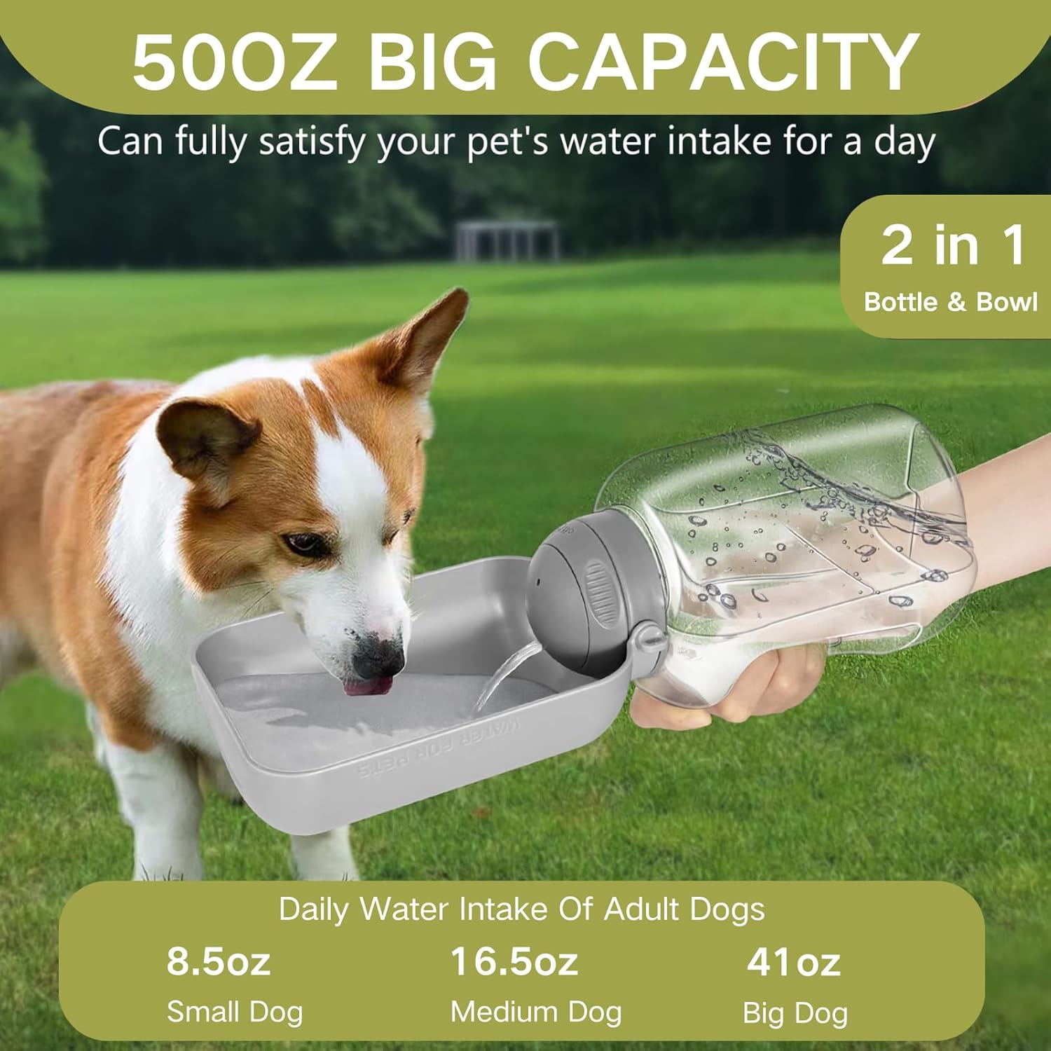 • Large capacity for all-day hydration: This dog water bottle comes in a large 50oz capacity and a 2-in-1 water and food bottle, ensuring medium to large dogs stay hydrated during long walks, hikes, or travel.
