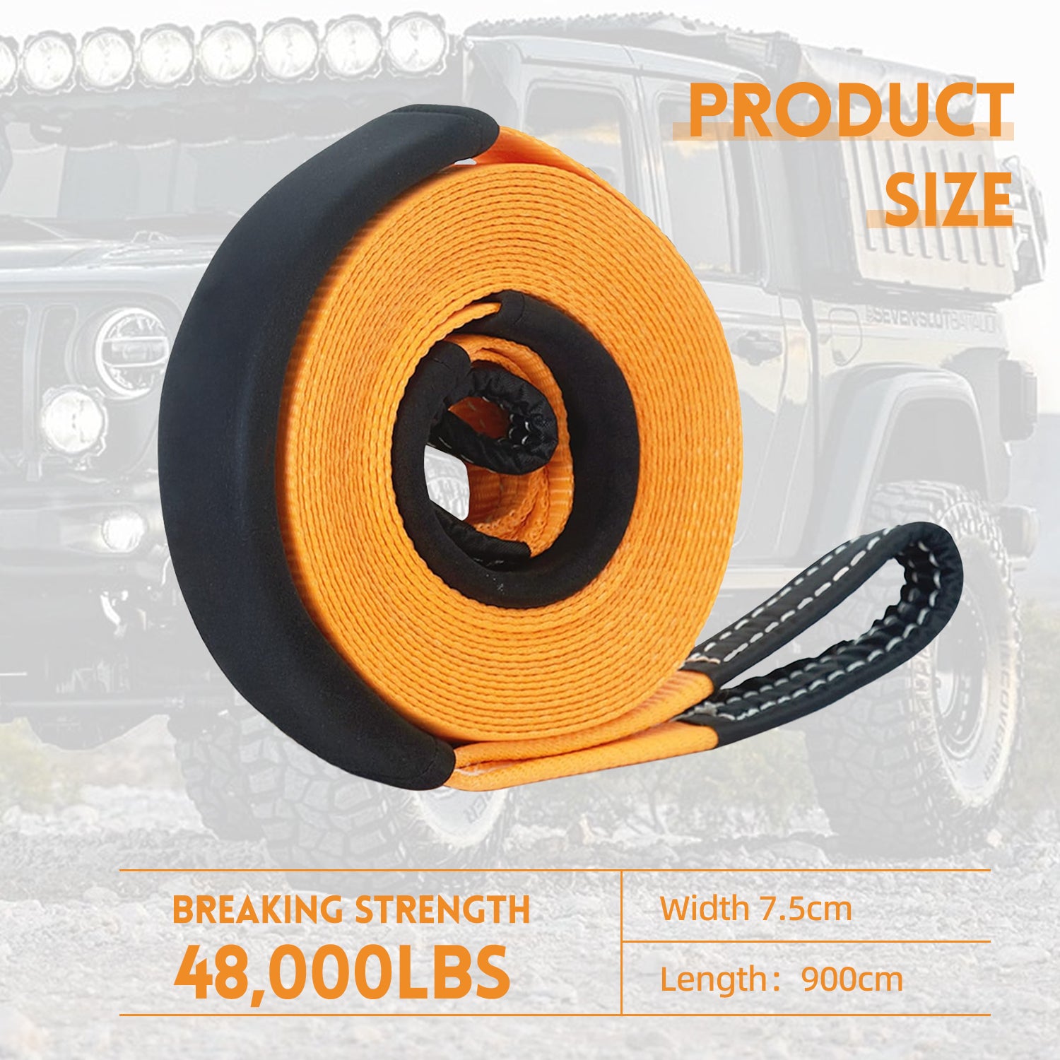 • Worry-free design: Certified 35,000 Lbs break strength allows you to recover nearly all stuck vehicles and even semi trucks. Features include triple reinforced eye loops and neoprene protective sleeves. With this Recovery Strap, you do not need to check work load limit or safety factors, only ensure the stability of recovery points.