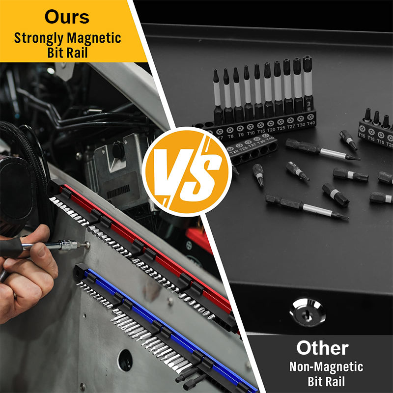 Sujeción firme: Sujeta firmemente las puntas con un resistente riel magnético de aluminio, manteniéndolas en su lugar incluso al colocarlas boca abajo o de lado. La base revestida de goma protege las superficies de arañazos indeseados.