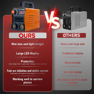 • LED display: Compared to other traditional displays, our intelligent LED display can help you see the data more clearly, such as the current, electrode dimension, function mode, and welding mode.