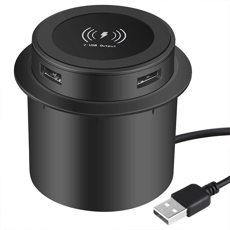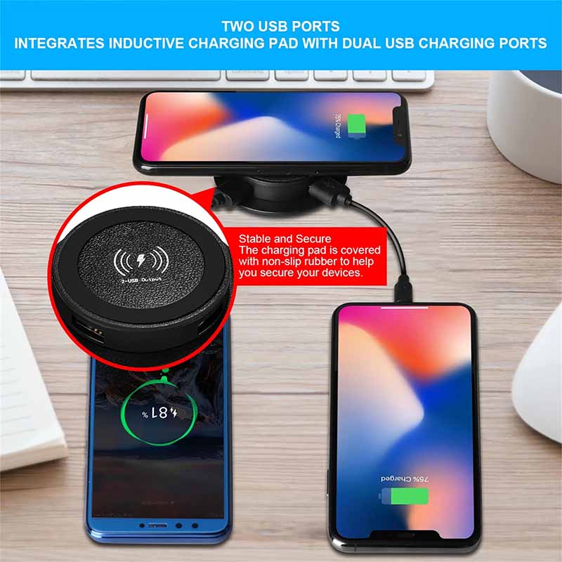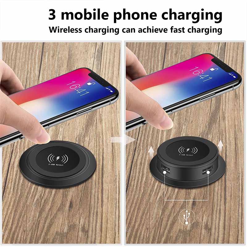Wireless charger: This desktop wireless charger is a circular invisible mount transmitter. It is equipped with 2* 5V/1A charging function, ready to charge for your mobile phone. There is no plug when charging the mobile phone, which is more convenient and fast.
