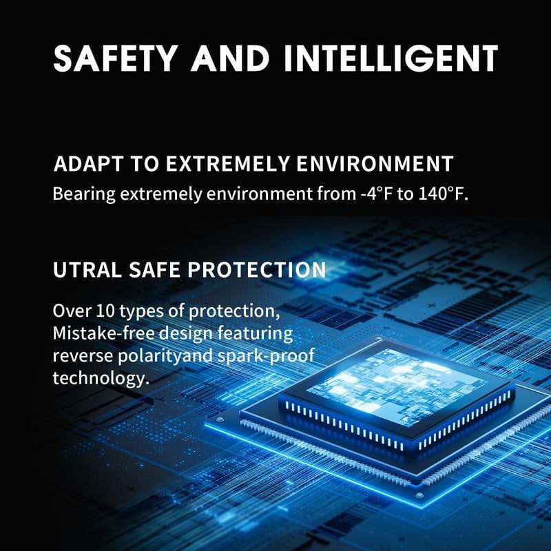 • 【10 Intelligent Secure Protection & Stable Operation】: Our car jump starter have 10 protection systems (reverse polarity, reverse charge, over discharge, reverse connection, short circuit, over charge, over current, over heat, spark resistance). High Power jump pack for car battery ensure your safety during using and the jump pack can work in -22°F ~ 140°F, even in any extreme weather.