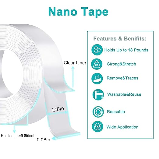 Heavy duty nano-tech adhesive tape: Built with the latest acrylic gel nano technology, this double sided tape offers ultra-strong adhesion and long-lasting hold. Ideal for wall, carpet, tile, glass, and metal surfaces indoors or outdoors.