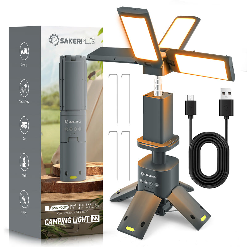 • Luz de camping versátil 3 en 1: Experimente la máxima versatilidad con la luz de camping 3 en 1 SAKER®, que combina una linterna potente, una linterna de camping eficiente y luz ambiental en un dispositivo compacto. Perfecto para iluminar tus aventuras con una cobertura de 360°, está diseñado para afrontar cualquier desafío al aire libre.