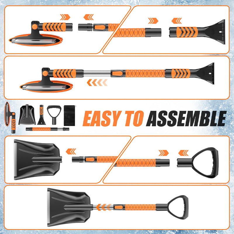 Easy to assemble and disassemble: The snow brush and ice scraper detach into three parts, taking up minimal space and storing easily in your car or trunk.