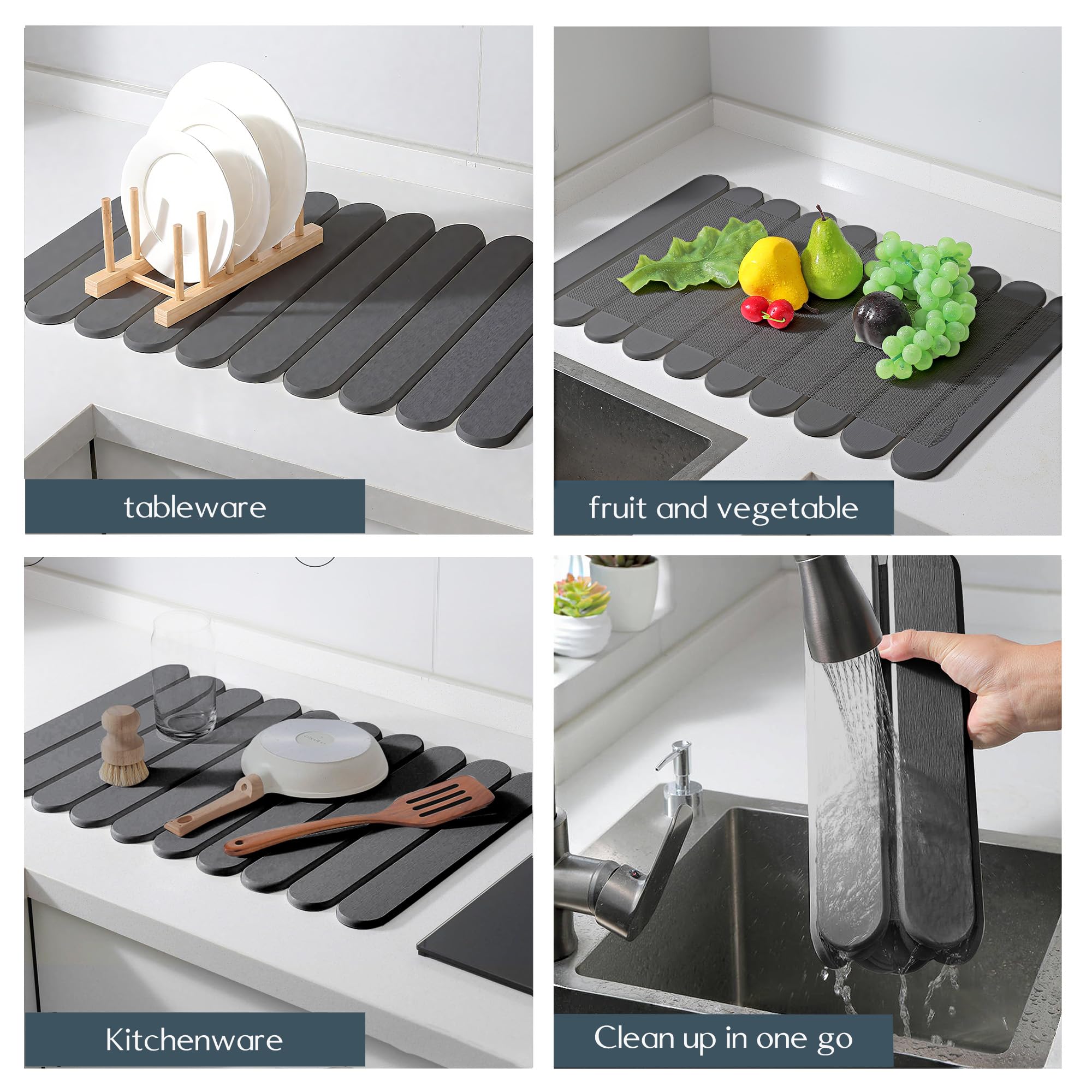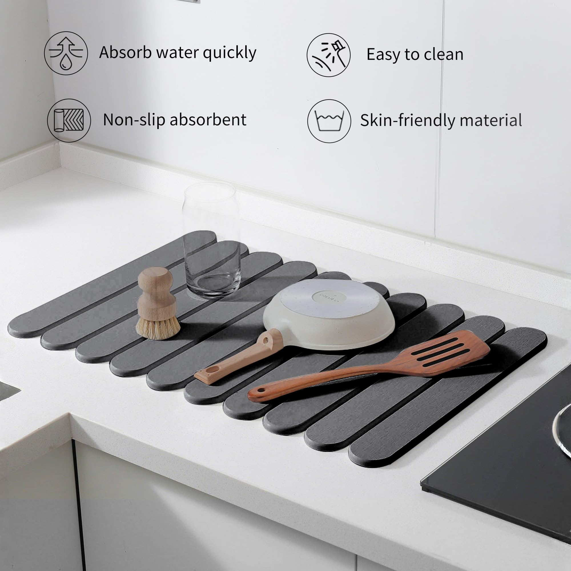 - Super absorbent & quick drying performance: The 24"×16" dark grey foldable stone dish drying mat instantly absorbs water from dishes and cups using diatomaceous earth, drying within minutes. It keeps kitchen counters consistently dry, clean, and free from water stains or odors.