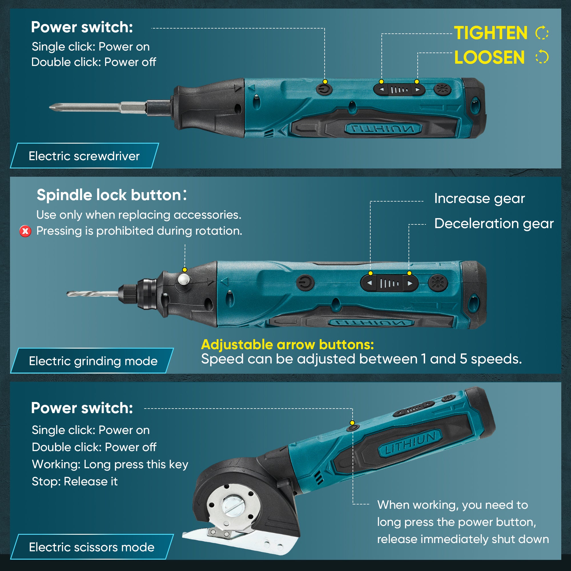 Multifunctional power tool: Not only a electric screwdriver cordless, with the detachable tool head system, you can switch it between an screwdriver, electric scissors, rotary tool, and a bright LED flashlight. Perfect for saving space and handling a vast range of tasks without the need for multiple separate tools.