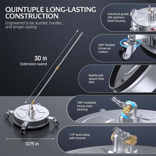• Durable & smart design: Built with industrial-grade 304 stainless steel and a reinforced splash-free skirt, this 13/15-inch cleaner offers unmatched durability. The 180° rotatable heavy-duty bearing and flexible 360° caster wheels ensure smooth maneuverability on any surface.