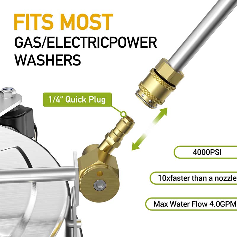 • Easy to use & compatible: Designed for both gas and electric pressure washers, the 1/4" quick connector makes setup effortless even for beginners. The ergonomic 30-inch extension wand ensures comfortable, no-bend cleaning.