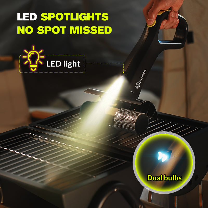 • Built-in LED spotlight for precision in the dark: Don't let the setting sun end your barbecue. The integrated LED light illuminates every nook and cranny of your grill, ensuring you can see and remove every speck of grease during nighttime cleanups. This smart feature makes our grill cleaning brush a standout among bbq accessories for grilling.