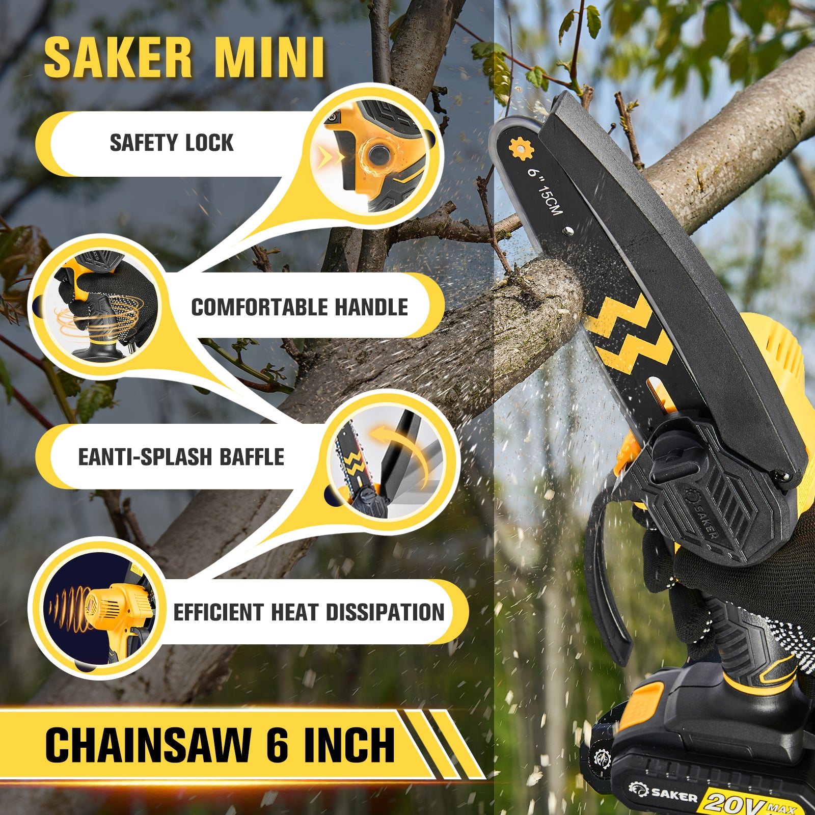 - Enhanced Safety Features: Your safety is our top priority. The Saker handheld chainsaw includes a safety switch to prevent accidental starts and a protective guard to shield your hands from debris. Work confidently knowing your safety is taken care of.