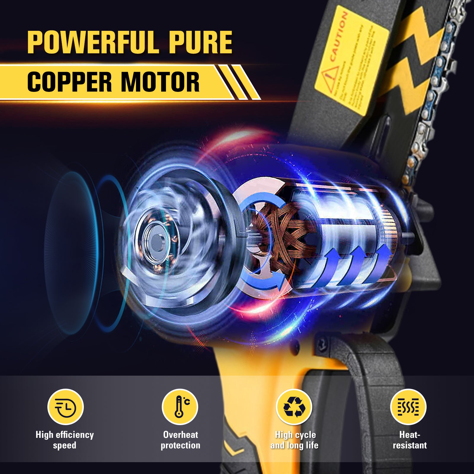 - Copper Wire High-efficiency Motor: The 6-inch Saker® Mini Chainsaw Cordless features a powerful copper wire high-efficiency motor, providing longer run-time, more torque, and increased power. This results in less wear and tear, extending the lifetime of your Saker handheld chainsaw.