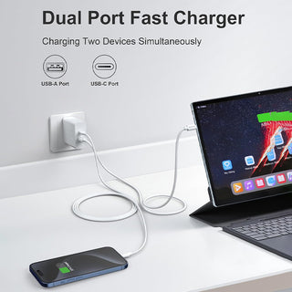 • Fast charging made easy: The USB C Wall Charger features a dual-port design with both USB-C and USB-A, allowing you to charge two devices simultaneously without compromising speed or performance. Its compact cube design is perfect for tight spaces or portability. Compatible with a variety of devices including iPhone, iPad, AirPods, Android phones, Switch, Google Nexus, and more, it supports USB-C Power Delivery to ensure your devices charge quickly, especially when you're in a rush!