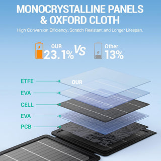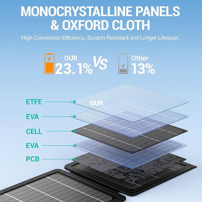 • 23.1% high conversion efficiency: 10W solar panels are made with premium mono-crystalline solar cells, generate energy from the sunlight, and perform better with 23.1% higher conversion efficiency, providing unlimited green power for your device under the sun.