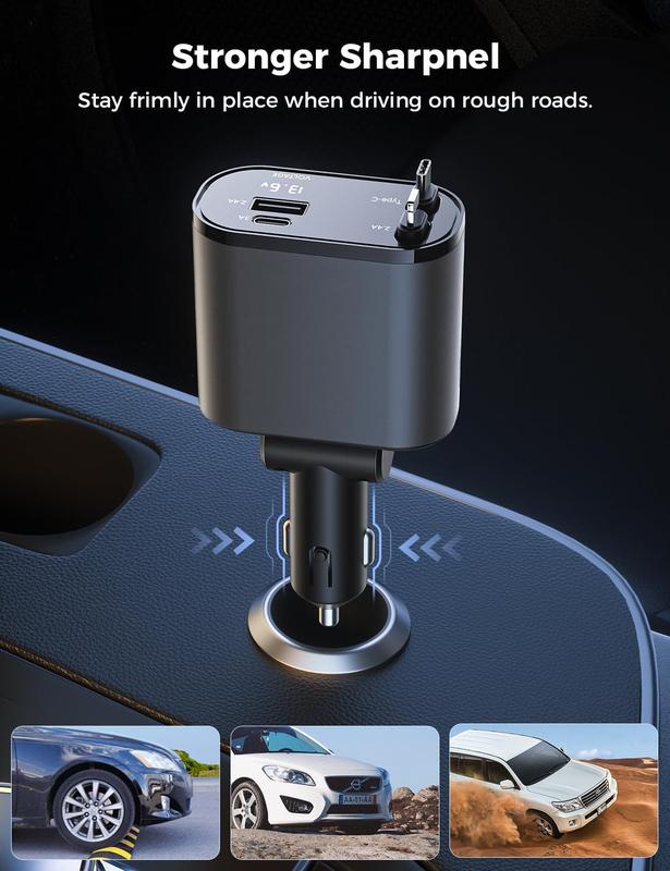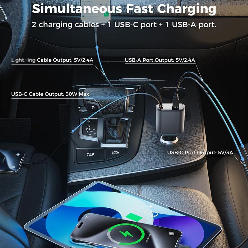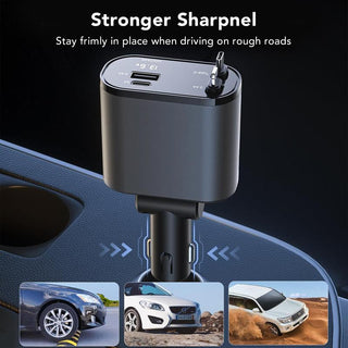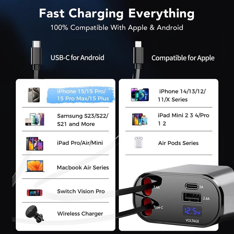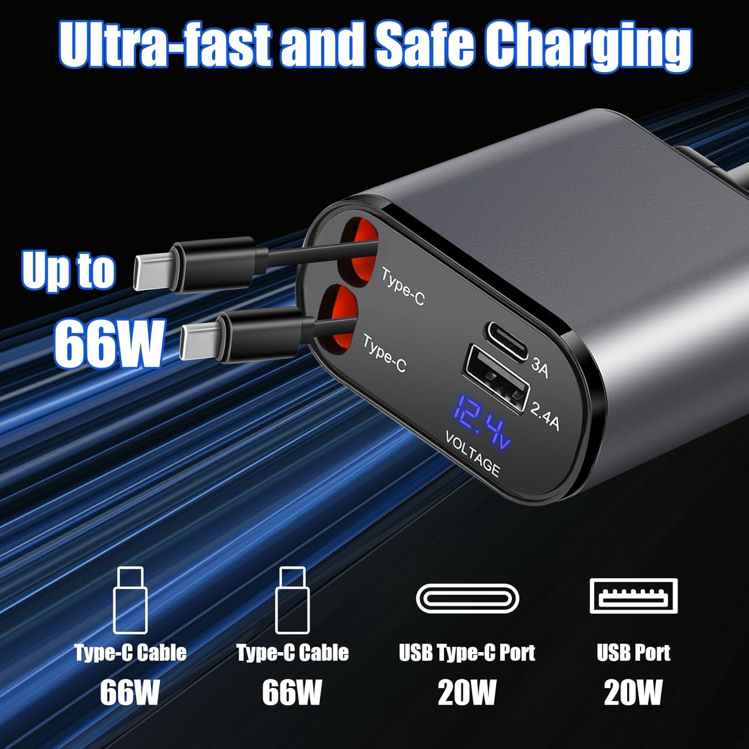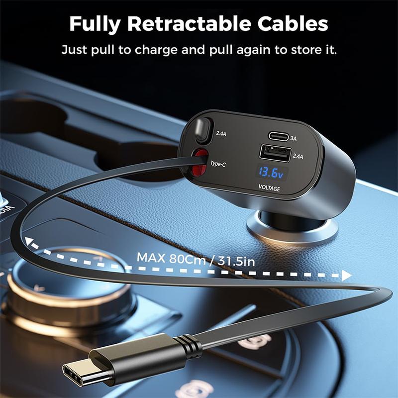 With a maximum output of 120W.This car charger comes with 2 stretchable charging cable, and the car charger retractable cable stretches up to 80cm/31.5 inches. The charger also has type-c female and USB-C ports give you more options to charge up to four devices at the same time.