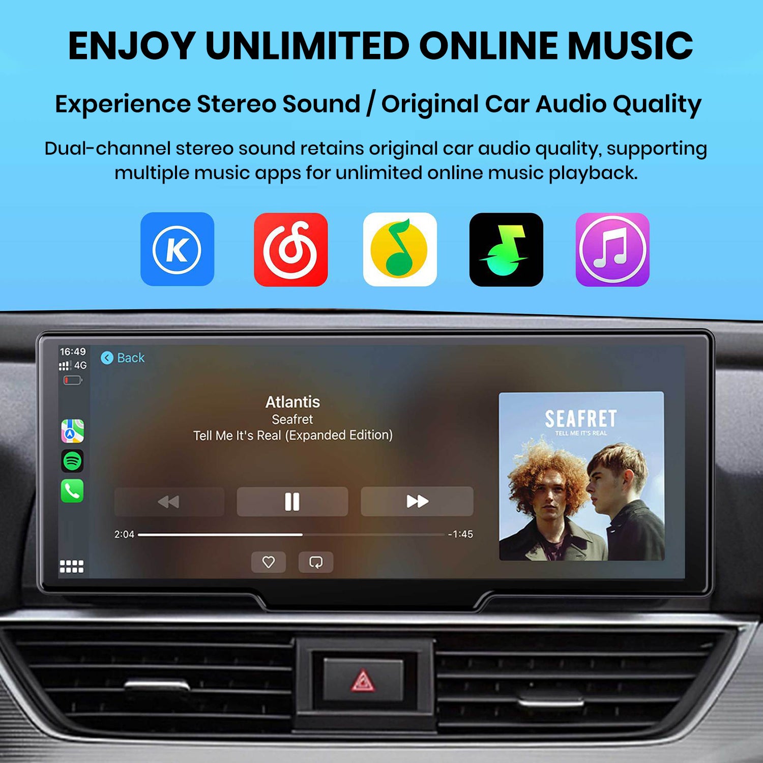 • Smart voice assistant, hands-free control: Supports Siri voice commands, allowing you to play music, navigate, and make calls through voice control, minimizing manual operations and improving driving safety.