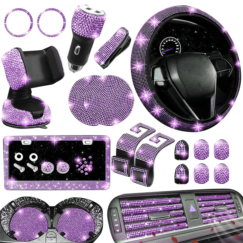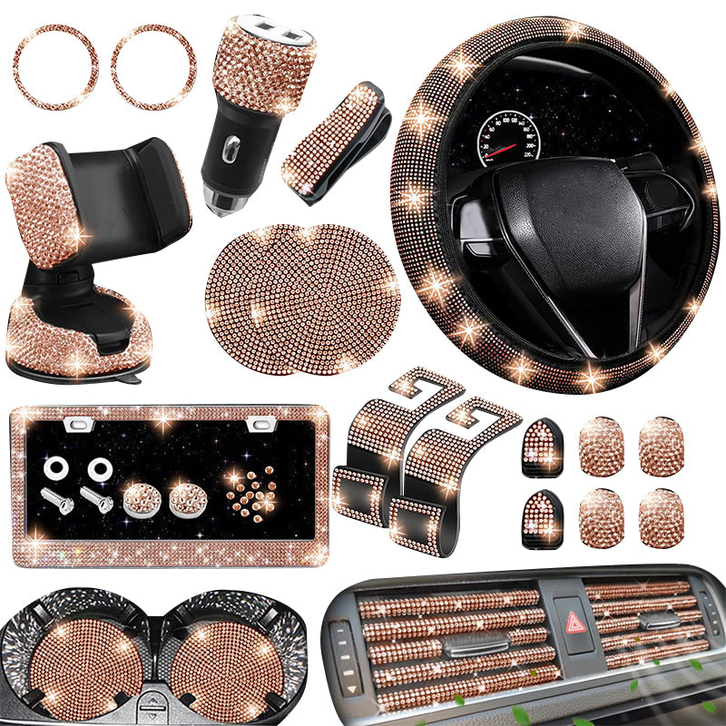 • Package include: The NBTEPEM bling car accessories set is value for money. You will receive: 1 pc steering wheel cover, 1 pc phone holder, 1 pc license plate frame, 10 pcs car vent outlet trim, 1 pc dual USB charger, 2 pcs car coasters, 2 pcs car seat back hooks, 1 pc glasses holder, 4 pcs valve caps, 2 pcs start button rings, and 2 pcs mini hooks.