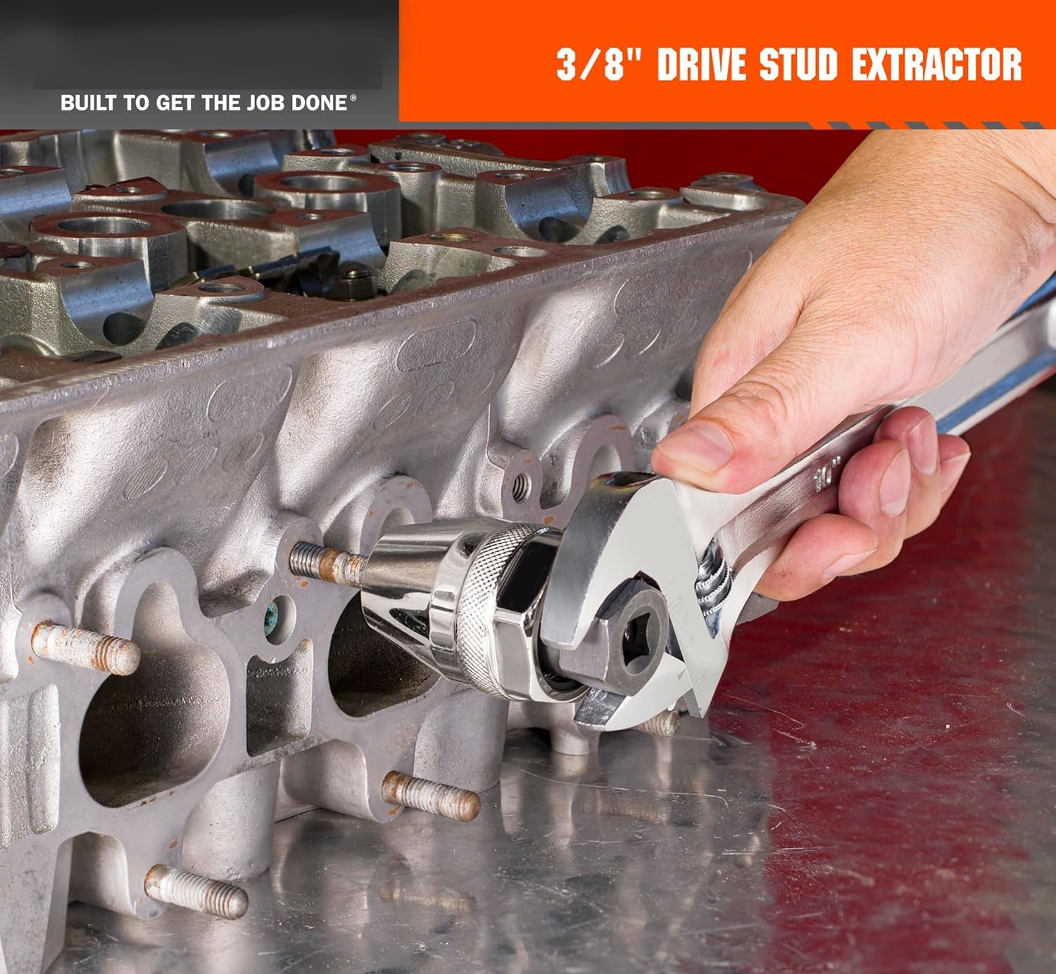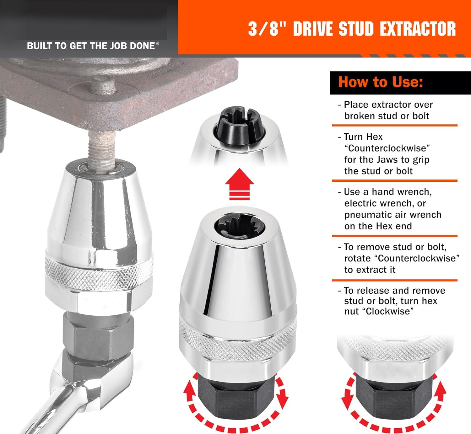 Fitment: 3/8-inch drive extractor fits 1/4-inch to 1/2-inch 6-13mm studs.