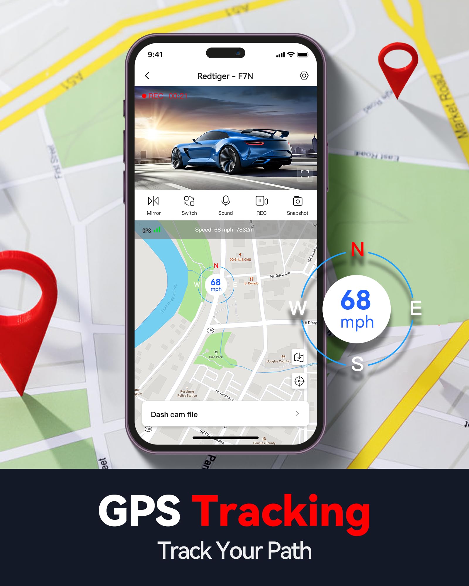 Gps & wi-fi: The Built-In GPS Module Enables The Front And Rear Dash Cam To Precisely Pinpoint The Vehicle’s Location, Routes And Speed In The Recordings Via The App And GPS Player On Your Smart Device. Connecting To Your Mobile Devices Through The Dashcam's Built-In Wi-Fi, Enjoy Wireless Data Transfer, Change Settings, Easily Control The Cam, View, Download And Share The Videos.