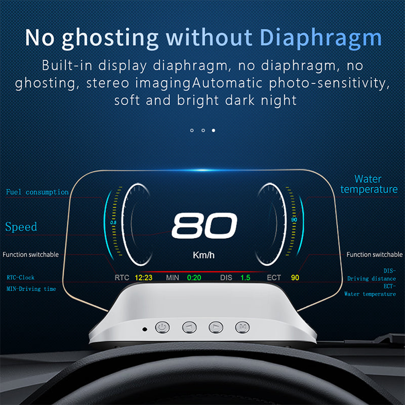 Clear windshield projection: Projects driving data directly onto built-in transparent lenses without reflective film, ensuring clear visibility in daylight and reducing driving distraction.