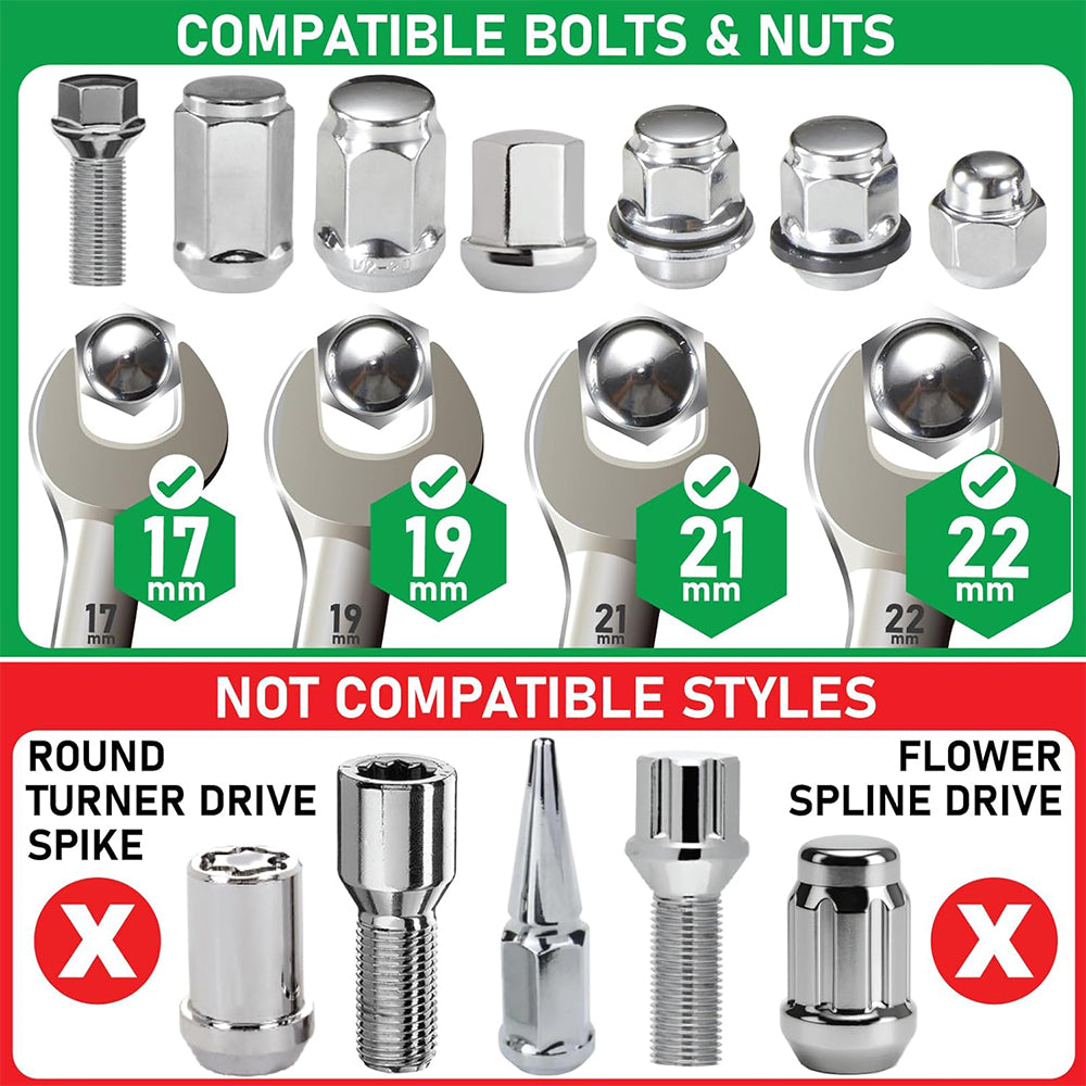 Compatible: Compatible With Conical, Spherical, Flat Seat, Mag Seat, And Open/Closed-Ended Lug Nuts/Bolts. Not For New, Deep-Recessed, Or Locking Nuts.