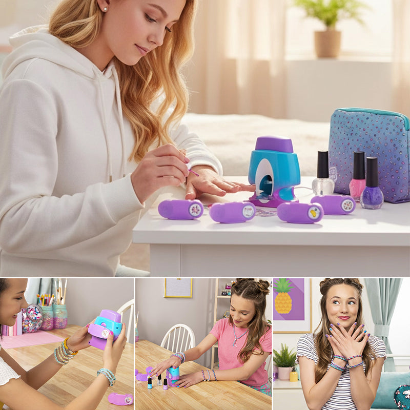 - Complete set: Comes with a portable stamper, five design pods, two nail polishes, one top coat, and instructions for kids and beginners.