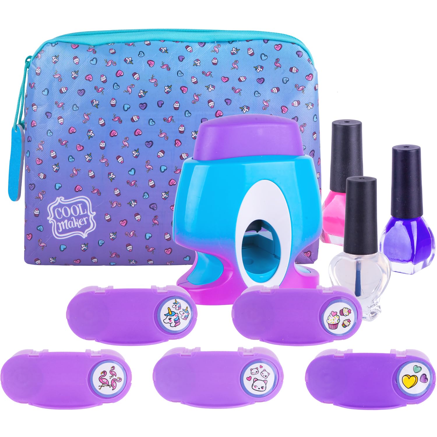 Creative kit: Includes five reusable design pods with flamingo, unicorn, cupcake, cat, and heart patterns plus two colorful nail polishes for endless nail designs.