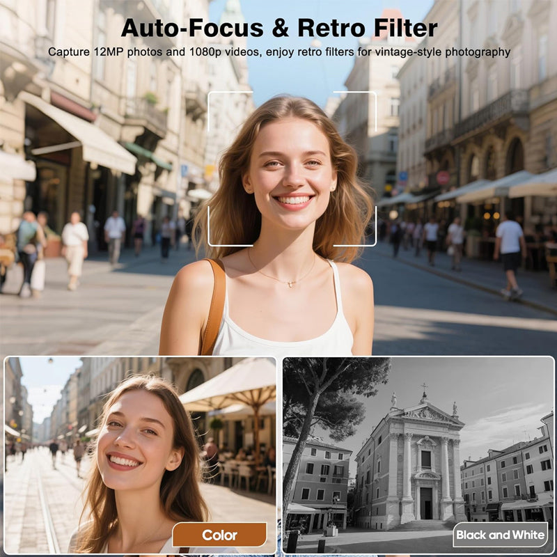 • Auto focus & effortlessly capture the moment: This retro digital camera has autofocus and can easily capture FHD 1080P videos and 12-megapixel retro photos. There is no need to manually adjust colors, brightness or complicated settings. Just press the shutter to capture precious moments, making shooting simple and fun! It can also capture photos in different retro styles, such as color or black and white
