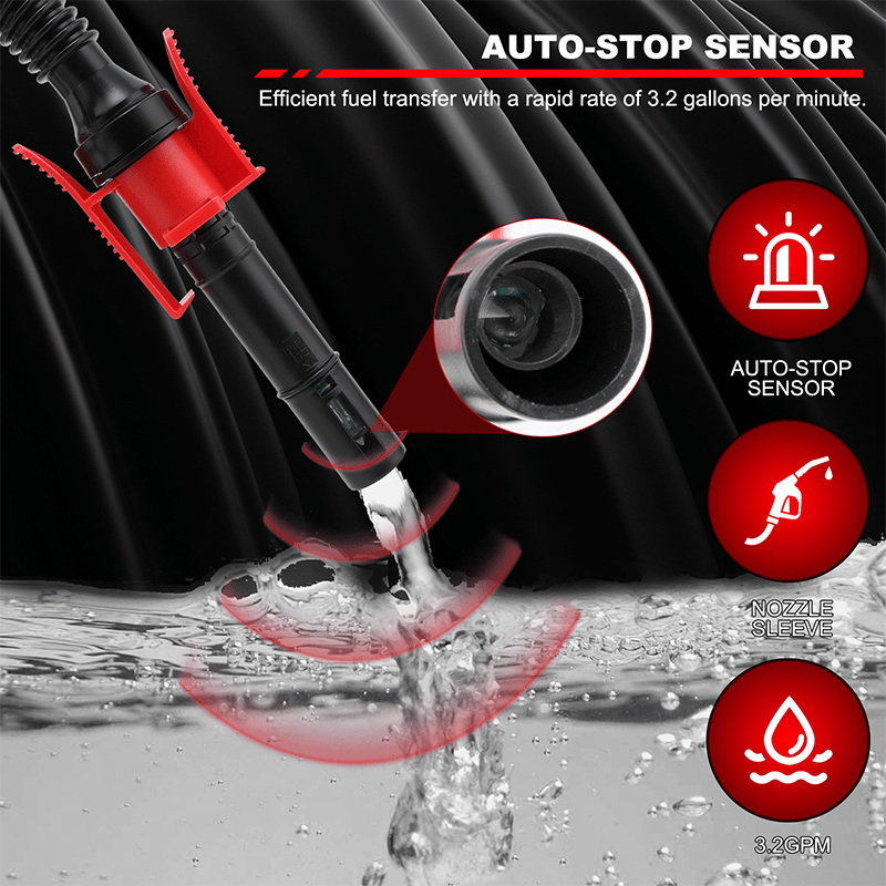 Automatic stop sensor: Transfers up to 3.2 gallons per minute and stops the flow automatically to prevent spills and fuel loss, with a built-in locking clip for hands-free operation.