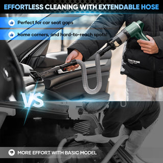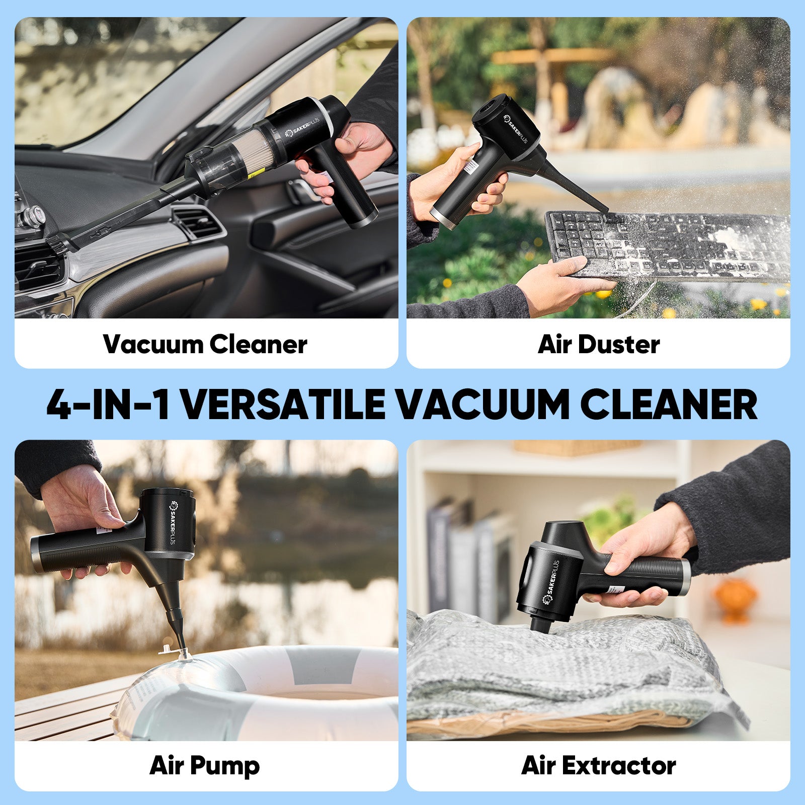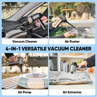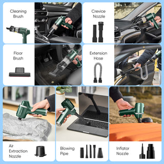 - 【4-IN-1 CAR VACUUM CLEANER】SakerPlus car vacuum offers 4 modes: vacuuming, blowing, inflating, and air extraction, perfect for various tasks. It comes with accessories like a floor brush, 2-in-1 flat nozzle with brush, telescopic hose, and long blowing pipe with brush for effective cleaning of carpets, car interiors, and tight spaces. Small and large inflator nozzles and air extraction nozzles are also included for inflating swimming rings or sealing bags.