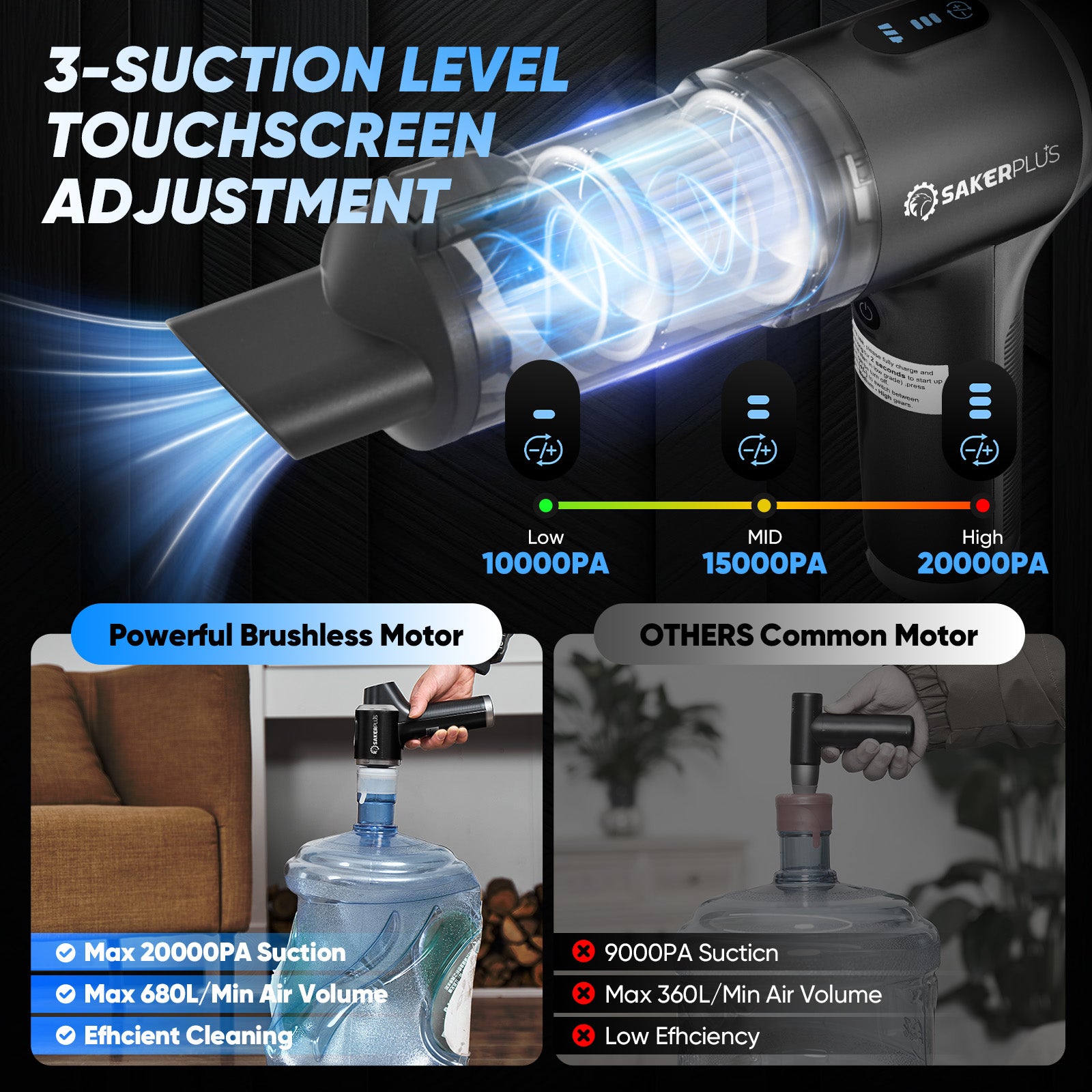 - 【3 ADJUSTABLE SUCTION LEVELS - UP TO 20000PA】Sakerplus car vacuum portable cordless offers 3 suction levels - 10000PA, 15000PA, and 20000PA, making it effortless to tackle stubborn dust in your car or keyboard, deep-clean carpets at home. Whether it’s cleaning your car seats, carpets, air vents, door seams, or dashboard, it delivers quick and thorough results. The low-noise operation (≤75dB) ensures a quiet cleaning experience without disturbing others.