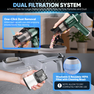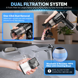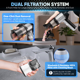 - 【ADVANCED DUAL FILTRATION SYSTEM】 SakerPlus handheld vacuum cordless features a 2-layer filtration system: a front filter for large debris and a HEPA filter for fine particles and dust. The washable and reusable filters prevent clogging and protect the motor for longer durability. With a lifespan of up to 10 washes before replacement, sakerplus small handheld vacuum comes with two additional HEPA filters upon receipt. Its 200ml dust cup with one-click emptying ensures hassle-free cleaning.