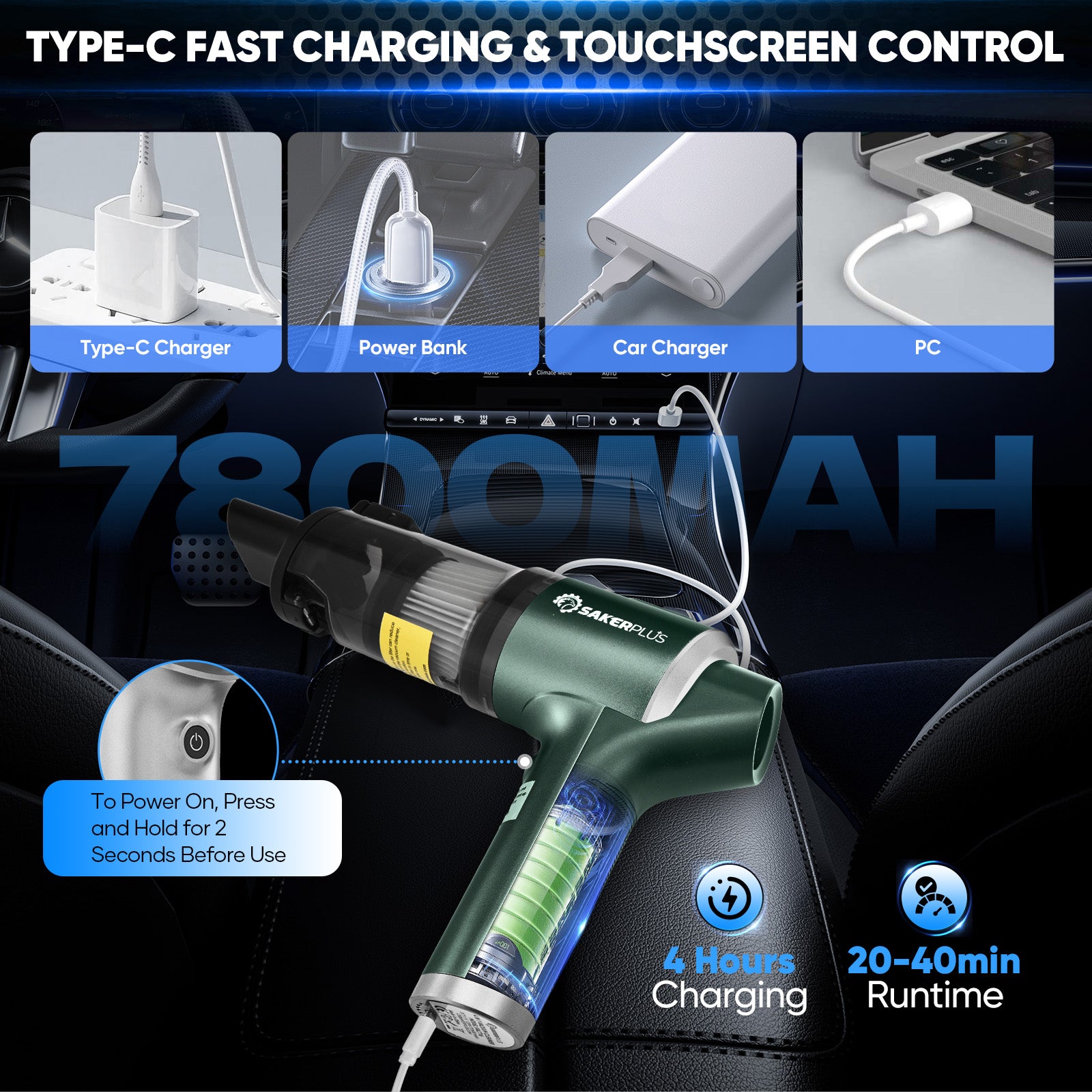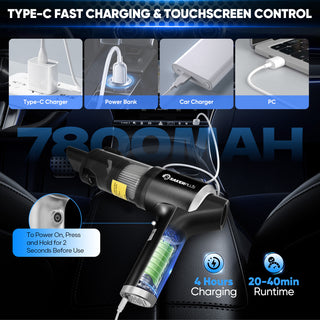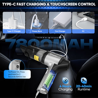 - 【7800MAH BATTERY & TOUCHSCREEN CONTROL】Featuring a 7800mAh rechargeable battery, Sakerplus car vacuum cleaner high power offers up to 40 minutes of runtime after a full charge in just 4 hours via USB Type-C. The touchscreen display provides real-time updates on battery life and allows for easy adjustment of suction levels, ensuring efficient and intuitive operation. (CAN’T ABSORB WATER OR LIQUID)