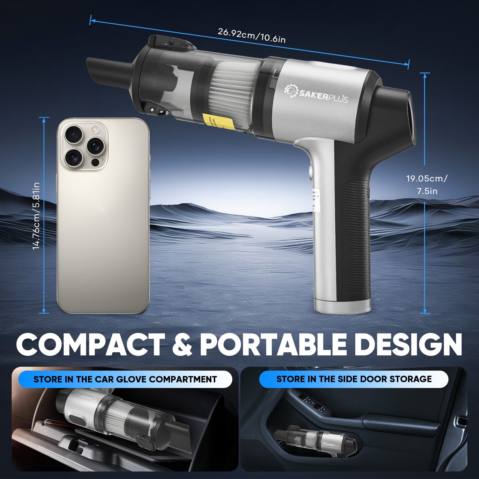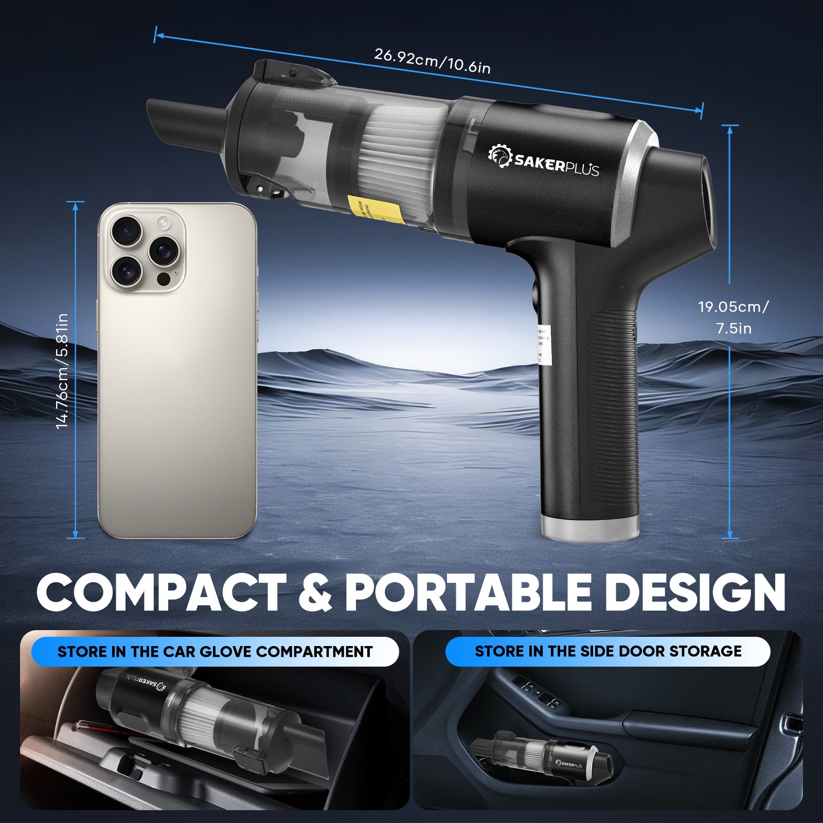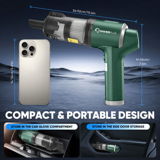 - 【LIGHTWEIGHT & COMPACT DESIGN - A PERFECT GIFT】Weighing just 1.12 lbs and measuring 10.6 x 7.5 x 2.6 inches, Sakerplus mini vacuum cleaner is easy to carry and store. The cordless design offers flexibility for cleaning cars, homes, and offices. Its stylish, multifunctional design makes it an ideal gift for Christmas, Thanksgiving, Mother’s Day, Father’s Day, Valentine’s Day, birthdays, or housewarmings. A practical and thoughtful gift that brings convenience and joy to your loved ones.