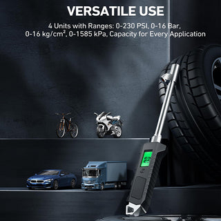 Works great on my motorcycle tires, but the flashlight feature is kinda weak. That said, the digital display is crisp and easy to read even in sunlight. The 4 unit options are handy when switching between my bike and car. Solid purchase overall!