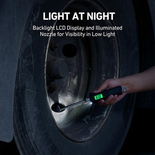 Just used this tire gauge on my F-150 and I'm really impressed! The green backlight makes it super easy to read at night, and the heavy-duty feel gives me confidence it'll last. The 0.1 PSI increments are perfect for getting my trailer tires just right. Only wish it came with a protective case!