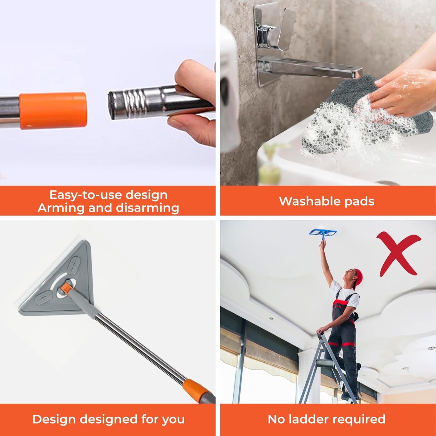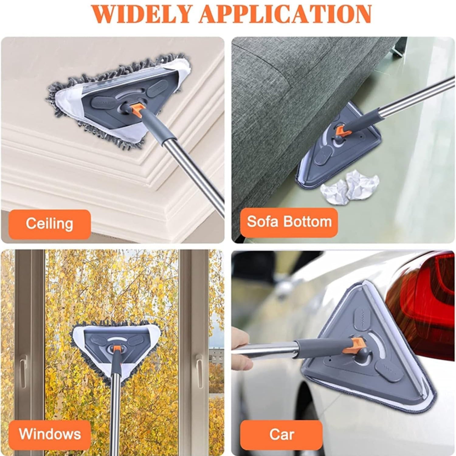 • 360° swivel mop head design: The triangular mop head can be adjusted to any angle, making it easier to clean corners and hard-to-reach areas. Additionally, the mop head features a locking function to ensure it does not collapse or flip when cleaning high places.