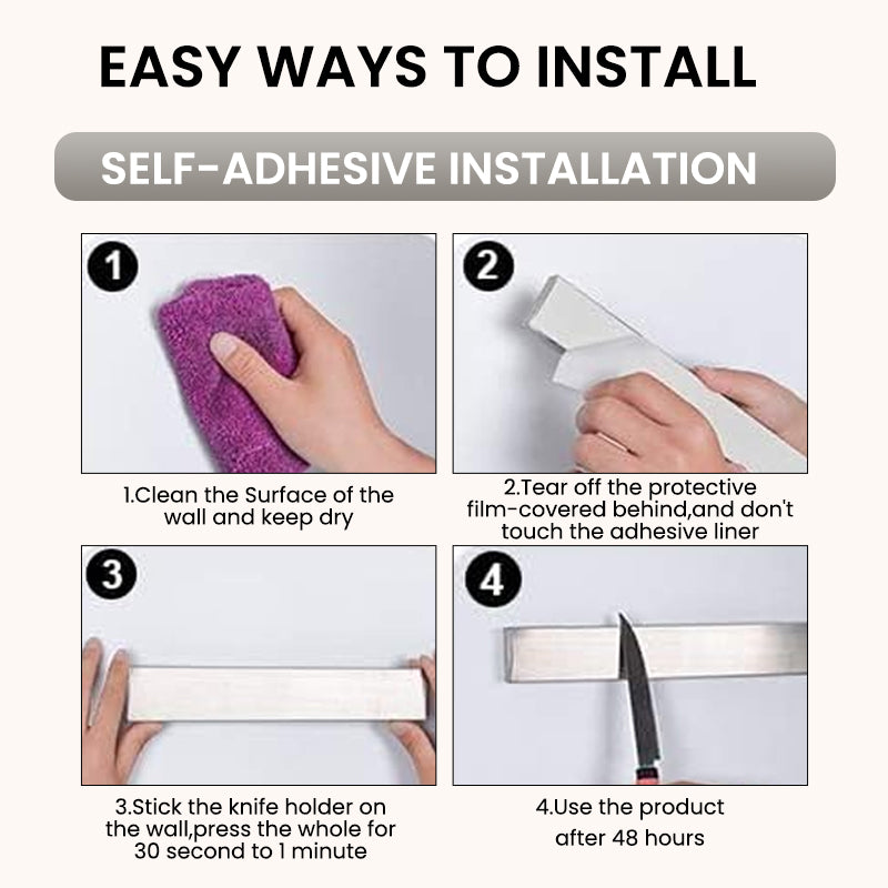 Just installed the Sakerplus knife holder and wow, that magnet is no joke! Holds my heavy chef's knife like it's nothing. The stainless steel looks so sleek against my white backsplash. Only thing - make sure you measure twice before drilling those holes!