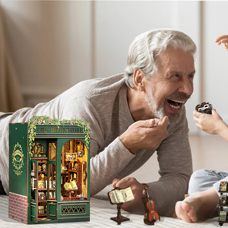 Absolutely love this little bookstore kit! The pre-colored wooden pieces snap together nicely - only needed glue for a few parts. The LED lights add such a cozy vibe. Took me about 2 hours to assemble while watching TV. Perfect gift for book lovers!