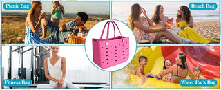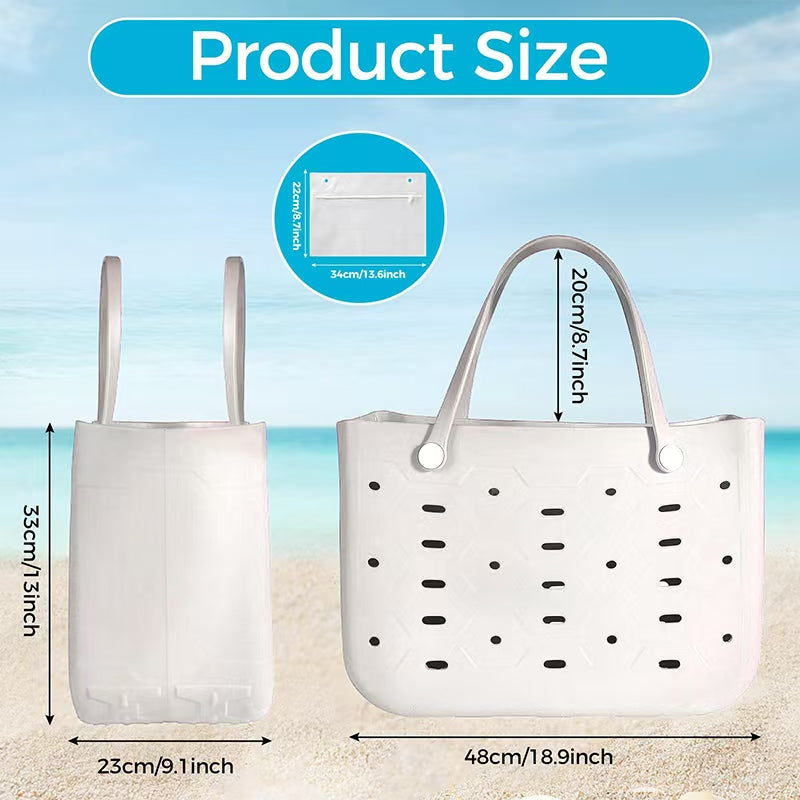 • Beach Tote Bag: Extra large capacity 18.9"*13"*9.1'' (length*height*width): enough to hold drinks, snacks, sunscreen, sunscreen lotion, shower gel, slippers, etc. One bag can hold everything you need for fitness or play. This perforated outdoor travel bag is made of high-quality EVA material, which is strong, durable and quick-drying. The whole body is made of rubber material. The bumps on the bottom of the large beach tote are designed to be non-slip. The reinforced base adds stability to the washable bag, allowing it to remain standing. You no longer have to fret over well-prepared items falling to the ground.