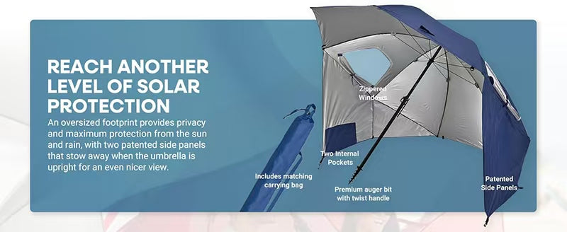 • 9-Foot Umbrella: Expansive 9-foot canopy umbrella delivers larger shaded coverage than standard outdoor umbrellas--perfect for the beach, camping, sports events, concerts, and festivals. Made with advanced UPF 50+ material that blocks 99.5% of harmful UV rays for a safe and comfortable experience during extended outdoor activities.